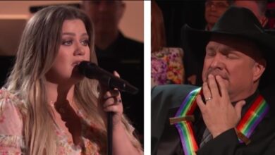 Garth Brooks becomes emotional as Kelly Clarkson performs his song “The Dance”.
