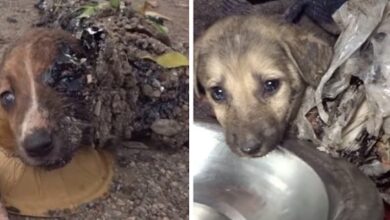 Four small dogs were almost killed after tripping over tar dumped in a rubbish heap. Only their eyes were able…